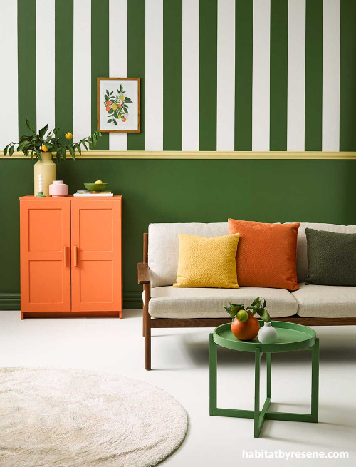 Lemons, limes and oranges are a popular motif in interiors at the moment. Base of wall to dado is in Resene Clover, dado rail trim in Resene Chenin and stripes in Resene Clover and Resene Rice Cake with floor in Resene Rice Cake. Large coffee table in Resene Dingley, cabinet and round vase on coffee table in Resene Smoke Tree, small vase on coffee table in Resene Midwinter Mist, large tall vase with lemon branches in Resene Chenin, candlestick holder in Resene Dingley, pink vase in Resene Paper Doll and bowl on books in Resene Green Leaf. Sofa from Città, cushions and art from Kmart, candles from Superette. Project byVanessa Nouwens, image by Wendy Fenwick.