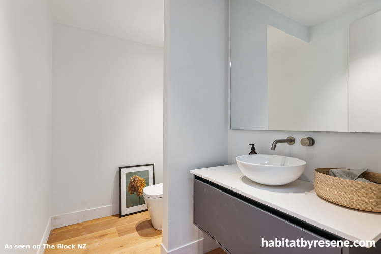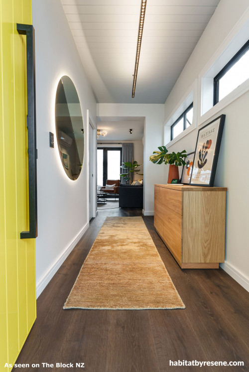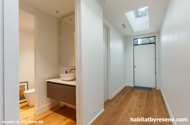 Despite hitting a few bumps this week, Tim & Arthur turned things around to create some simple yet elegant spaces. They used Resene Black White in their entrance and powder room, creating the illusion of space that provided the areas with a clean finish. The skylights throughout the hallway created a feeling of added height and the timber floors grounded the look.