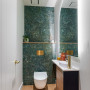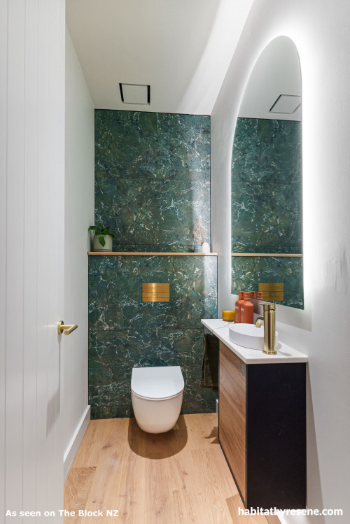 Connie & Rach’s powder room utilises very similar tiling to that seen last week in Meg & Dan’s family room. The green tiles complement the walls and ceiling in Resene Barely There and pops of gold add a feeling of elegance.