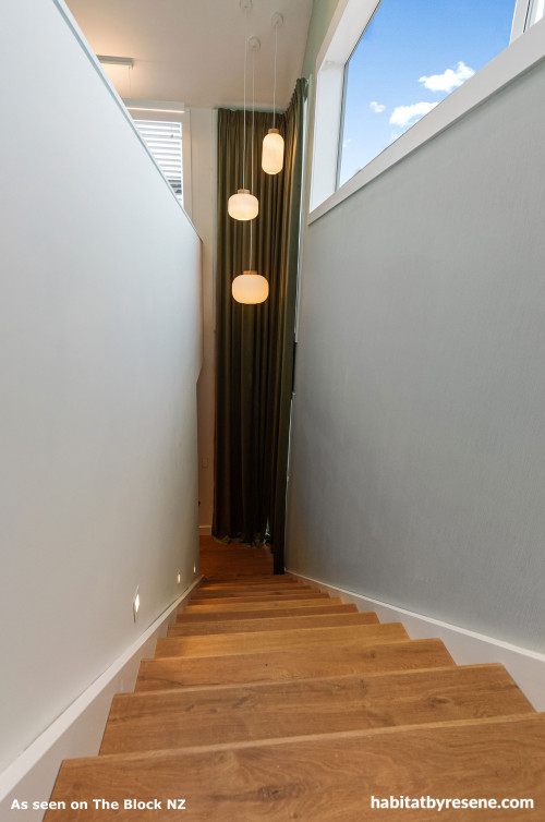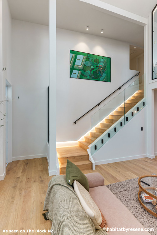 Connie & Rach created some elegant spaces this week and continued their luxe design into their powder room and staircase. Using Resene Barely There on the walls, ceiling and trim, they created a sophisticated powder room with pops of gold and deep green tiling. Their staircase was both practical and beautiful, with LED lights highlighting the timber stairs and a large art piece continuing their green colour scheme.