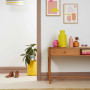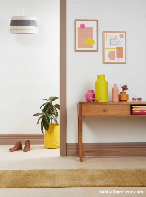 Trims in Resene Tablelands contrast with Resene Rice Cake and ply flooring finished in Resene Aquaclear. Introduce bold colours on painted objects; the large vase is in Resene Hive and the smaller vases are in Resene Twisted Sister and Resene Smitten. DIY artwork echoes the vase paint selection in Resene Tablelands, Resene Smitten, Resene Ethereal, Resene Twisted Sister, Resene Hive and Resene Just Dance paired with a lampshade painted in Resene Quarter Bokara Grey and Resene Hive. Teak console from Freedom Furniture, floor runner from the Ivy House. Project by Kate Alexander, image by Bryce Carleton.