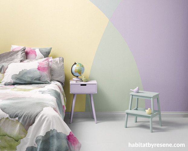 While geometrics have been a trend leader, circles have eternal charm. For colour-loving kids, this intersecting circles wall treatment using favourite Resene colours is modern and fun and creates a cute contrast with bedding.