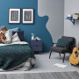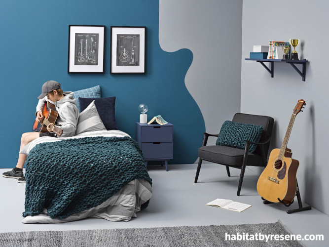 Get your kid’s bedroom in tune with their interests by painting their favourite instrument on the wall. A guitar silhouette painted in Resene St Kilda creates a bold backdrop for a blue-themed room. Keep the colour scheme simple by using Resene Half Raven on the other wall on the floor to create a strong contrast. Build up the blue tones with Resene Licorice on the bedside table and add a pop of white with Resene Surrender on the lamp base. Quilt cover from Kmart, pillowcase from Country Road, navy cushion from Shut The Front Door, Akori peacock cushion on chair from Freedom Furniture, grey rug from Adairs, armchair from Nood, artwork from Etsy. Other items stylist’s own. Project by Melle Van Sambeek, image by Bryce Carleton.