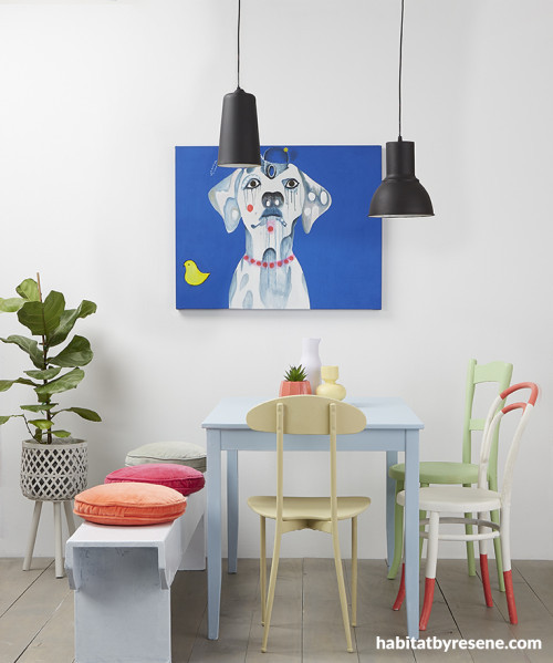 Sorbet colours mixed with spicy tones create a playful dining experience. Create this fun look by layering colour starting with the cool grey-blue Resene Frozen on the table enhancing the warm yellow Resene Spring Fever on the chair at the front with the fresh green hue of Resene Anise on the back chair and the white chair painted in Resene Bubble White with accents of Resene Rapture. The bench seat in Resene Pattens Blue provides a gentle contrast to the table. Jug vase in Resene Blue Chalk, tall vase in Resene Frozen, small plant pot in Resene Rapture and pendant lamp in Resene Nero. Balance the look with neutral walls in Resene Double Alabaster and flooring in Resene Colorwood Mid Greywash for a crisp, contemporary finish. Plants from Give Plants, cushions from Castle and Things, Dalmatian artwork by Jessie Breakwell. All other props are stylist’s own. Project by Annick Larkin, image by Bryce Carleton.