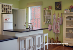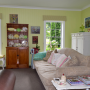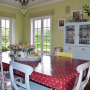 The living room continues the theme... note the bright, fresh flowers and country green view looking like a painting through the windows.