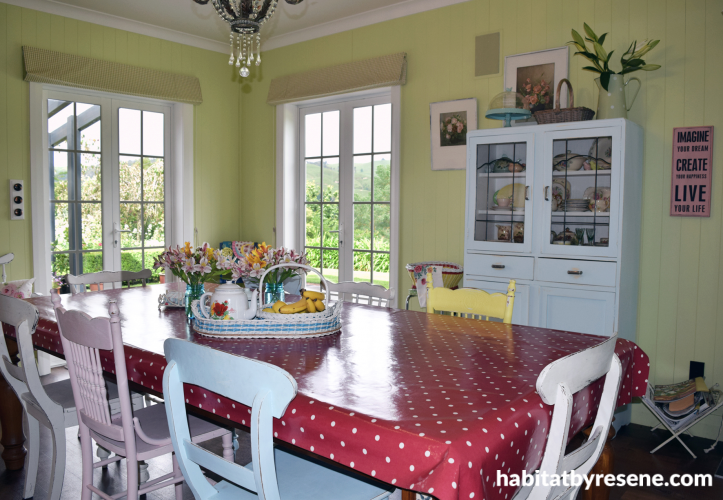 A lot of the furniture is also painted in Resene paints. We painted the dining chairs in Resene Onahau (blue), Resene Paris Daisy (yellow) and Resene Sweet As (pink). The dresser is also in Resene Onahau.