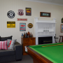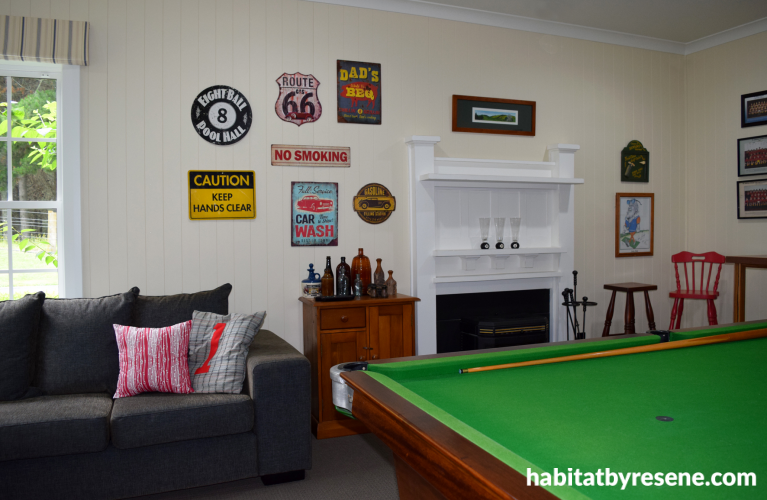 The games room where Kevin and co relax while Sheryl is working on her sewing and upcycling projects. The walls are painted in Resene Spanish White and the rest is painted in Resene Rice Cake.