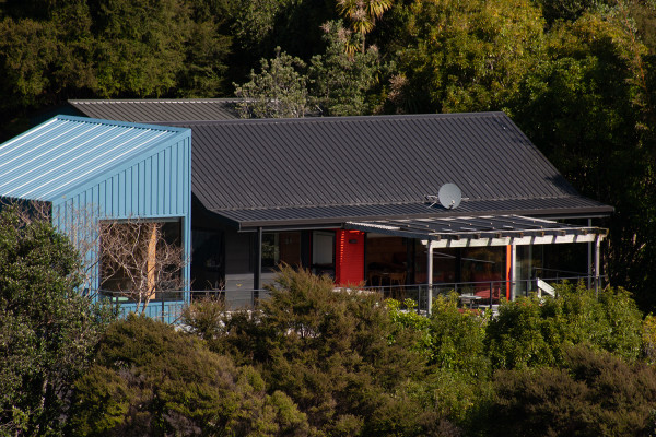 This Kuaotunu exterior features the bright Resene Clockwork Orange on the extended living space, with contrasting All Black and the breezy blue of Azure on COLORSTEEL®. Using darker and cooler tones alongside a confident colour, like the iconic Clockwork Orange, helps ground the overall look, giving the eye somewhere to rest while still letting the bold hue shine. It’s a great example of how strong exterior colours work best when they’re paired with calmer companions, creating contrast, depth and a finish that feels deliberate rather than loud.