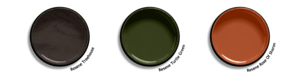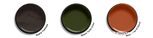 Darker and earthy hues likeWaterborne Woodsman Treehouse stain and Turtle Green paint finish look stunning in bush or rural settings, and pair well with darker oranges like Rose Of Sharon: