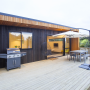 For an urban, bush-clad site in Warkworth north of Auckland, BK Design chose vertical timber cladding for this home but chose to emphasise the recesses in the front and back of the house with a change in stain colour. For the ‘frame’ of the recess, they used Wood-X in colour Kauri Gum, available from Resene, and for the inside of the frame, they used Wood-X in colour Foundry.