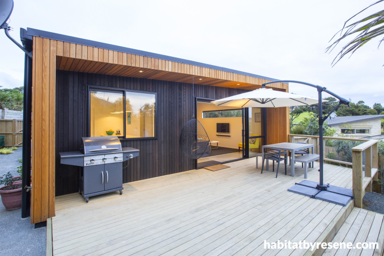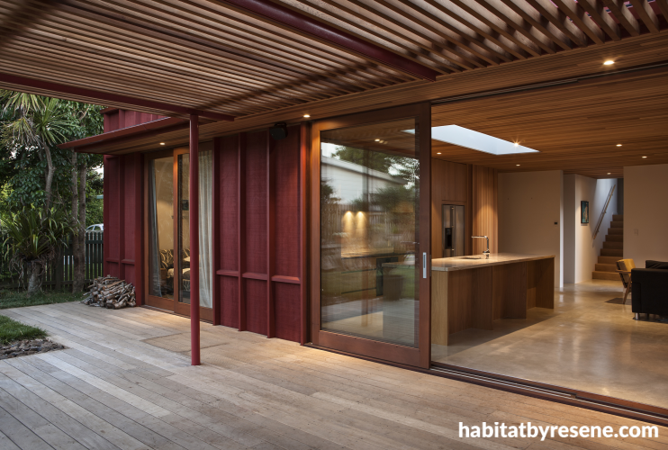 Band-sawn plywood and over-sized battens stained in Resene Woodsman Totem Pole red is an unusual but fitting treatment for this addition.