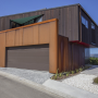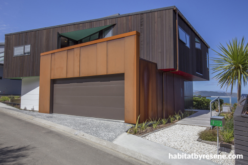 Hits of colour peek out from the soffits of this striking home designed by Cameron Driver of Maximarc – the green on the triangular soffit is Resene Atoll, on the bottom soffits are Resene Fruit Salad (green on the left), and Resene Red Berry on the right. The garage frame is corten steel, the lower floor is painted in Resene Hint of Grey, the garage door revels are Resene Lignite and the stain look can be replicated with Resene Treehouse.