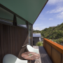 The house has a number of angled setbacks in the façades for shelter, ventilation and access, and the upper floor overhangs the lower. This created a series of physically discrete soffit areas of differing sizes and shapes. Splashes of colour could be used in these areas but not fall foul of the covenants – in Resene Red Berry, Resene Malibu, Resene Atoll and Resene Fruit Salad.