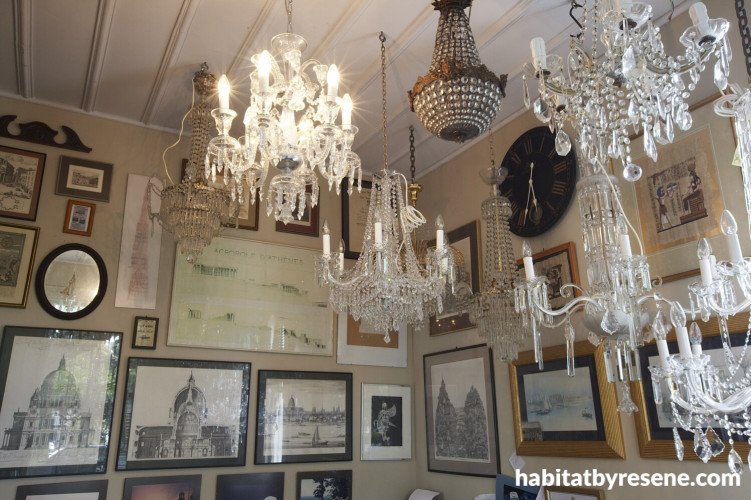 Like a room from another era, Roscoe’s workshop is filled with chandeliers, vintage prints and antique photographs.