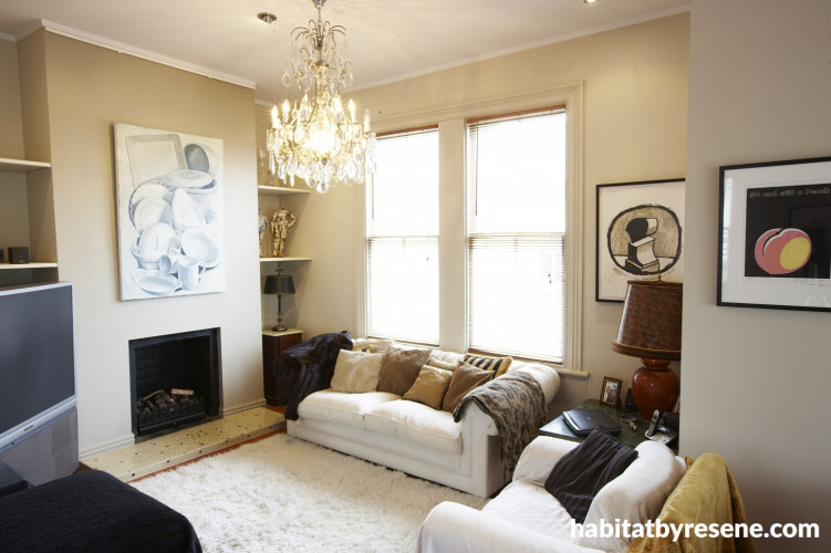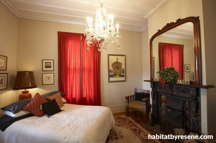 Originally built in the 1860s, the house is currently bedecked in neutral colours (Resene Tea and Resene Porcelain inside, Resene Pipi and Resene Armadillo outside), but that is subject to change, because Roscoe is constantly renovating and changing. The front bedroom, for example, was entirely painted red not long ago. The living room had a stained glass ceiling for a while. And Roscoe is currently contemplating mirrored doors and modern wallpaper.