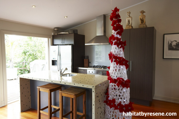 But for now, the colour comes from the Christmas decorations, for which Roscoe is locally famous. As the founder and organiser of the Franklin Road Christmas Lights (a spectacle which involves Auckland’s Franklin Road transforming into a magical fairyland of lights), his home is fittingly covered in 40,000 light bulbs which flicker on and off in time to music, while his garden is filled with literally hundreds of shiny red and green baubles.
