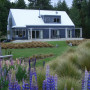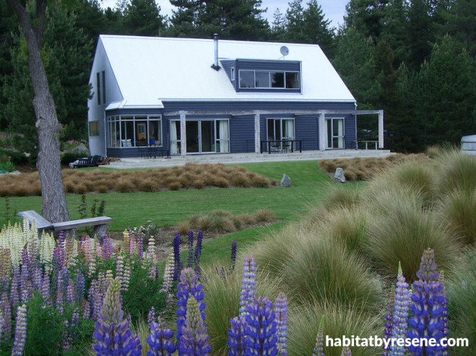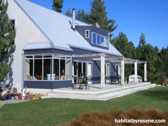 Although it's not winter at Lake Tekapo right now, we couldn't resist showing you this photo of Derek and Elizabeth's home, known as Riverside Cottage, in wintertime. While those in the northern hemisphere may be having a white Christmas, Derek and Elizabeth are having a sunny one. (Check out our other photos to see what the cottage currently looks like.) It's just as pretty and magical in summertime, but with all that snow gone you can see that the house is a unique alpine-style cottage made of corrugated iron and weatherboards, painted Resene Rhino grey-blue. Heavy macrocarpa beams over the patio are used to support shade sails in summer.