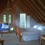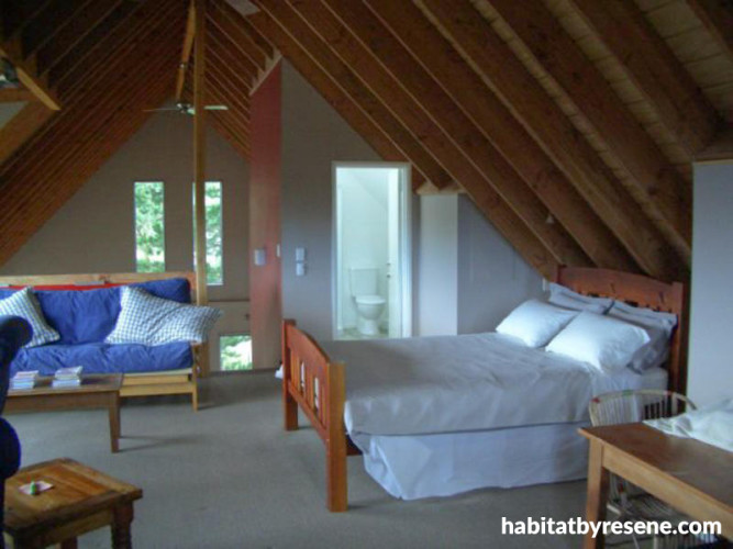 "The 45 degree pitched, timber beamed ceiling adds to the alpine feel of the house," say Derek and Elizabeth. This mezzanine bedroom/living area is one of their favourite spaces in the house.