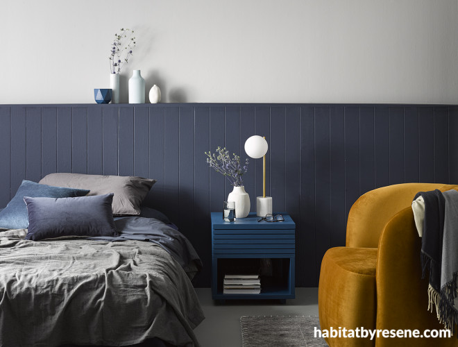 Wall in Resene Quarter Emerge with tongue-and-groove panelling in Resene Indian Ink, floor in Resene Half Chicago, nightstand in Resene Wishing Well and vases in (from left to right) Resene Wishing Well, Resene Remember Me, Resene Mystery and Resene Poured Milk. Chair from Contempa, rug from Freedom, throw from Furtex, bedding from Freedom and Furtex.