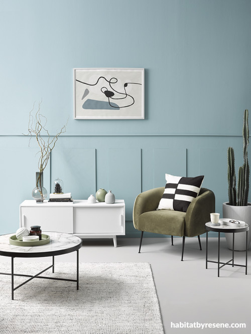 Wall in Resene Ziggurat, floor in Resene Mountain Mist, sideboard and large cactus pot in Resene Alabaster, tray in Resene Finch, vases in Resene Alabaster, Resene Wilderness and Resene Half Duck Egg Blue and DIY artwork in Resene Celeste, Resene Rolling Stone, Resene Nocturnal, Resene Blue Bayoux and Resene Alabaster with frame in Resene Half Duck Egg Blue. Chair from Contempa, coffee table, side table and rug from Nood.
