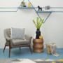 Wall in Resene Quarter Truffle with painted design and shelves in Resene Bismark, floor in Resene Bismark, large vase in Resene Nero and small vases in Resene Pizza, Resene Dune and Resene Dusted Grey and candleholder and horse ornament in Resene Nero. Chair, cushion, side table and rug from Freedom.