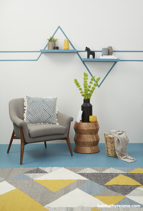 There are few blues that say ‘ocean’ quite like Resene Bismark. While it can look incredible as a main wall colour, it’s a sensational choice for flooring – especially if you like your walls fairly neutral. Resene Bismark has also been used to echo the triangular shapes seen on the rug, side table, cushion and basket as a simple-to-create painted wall design that turns a pair of floating shelves into a room-defining feature. Play up Resene Bismark’s yellow-green undertone with accents in scumptious gold like Resene Pizza complemented with warm neutrals like Resene Quarter Truffle, Resene Dune and Resene Dusted Grey for a fashion-forward look.