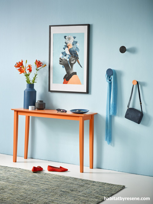 Not every powder blue is warming, but Resene Link Water gets its warmth from a hint of lilac. It works wonderfully with warm periwinkle, rich navy blue, delicate grey and crisp white such as Resene Polo Blue, Resene Bunting, Resene Flotsam and Resene Alabaster. These colours have been used to create a unique paint effect to showcase an original artwork by Hannah Jensen, one of many artists who paints her works using Resene products. The hero hue of the piece is a serene, clear, contemplative blue, Resene Time Out – which has also been used on the large vase. It’s worth pointing out that while this blue is cooler than the others in the room, that doesn’t mean it can’t be blended with warmer ones.