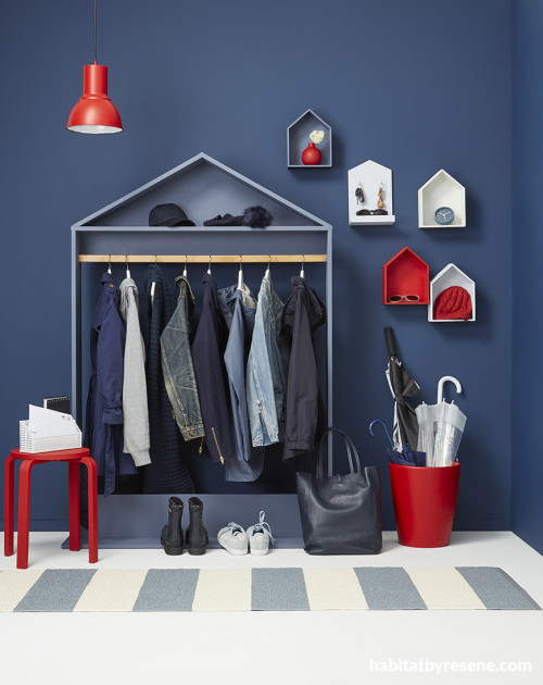 Walls in Resene Biscay, floor in Resene Sea Fog, coat rack in Resene Hammerhead , shelves in Resene Hammerhead , Resene Sea Fog, Resene Dynamite and Resene Breathless and pendant lamp, stool, bud vase and umbrella stand in Resene Dynamite.