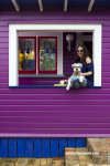 Fiona in the back porch with one of her miniature schnauzers Ramsey. The colours are Resene Troubadour for the weatherboards, Resene Deep Koamaru baseboards, Resene Vista White trims and Resene Jalapeno (red).