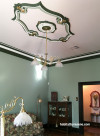 The living room ceiling rose is intricately executed in Resene Organic, Resene Olive Green, Resene Quarter Solitaire and Resene Gold Dust metallic, against a ceiling in Resene Wafer.