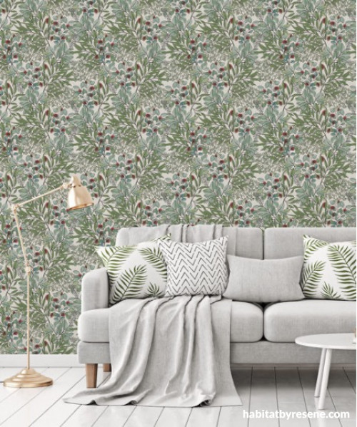 Try a verdant wallpaper with splashes of scarlet such as Resene Wallpaper Collection 37534-1, from the Resene Geo Nordic collection. Team with a similar painted floor in Resene Quarter Rice Cake.