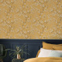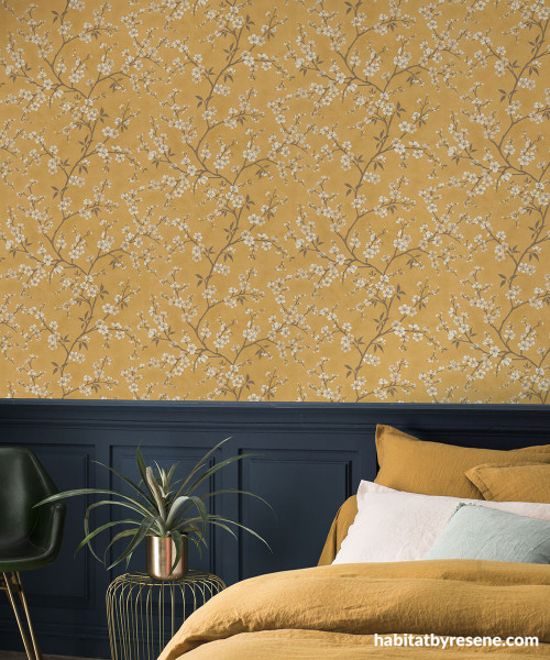 Brighten a room with a sunny yellow wallpaper in a Chinoiserie style with Resene Wallpaper Collection 456721, from the Resene DENZO II range. Team with panelling painted in Resene Midnight Express.