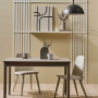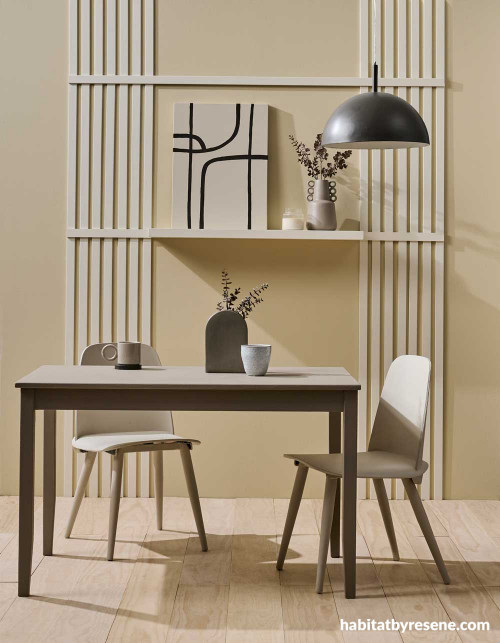 Create depth in a neutral room by creating batten details. The back wall is in Resene Triple Spanish White with battens and floating shelf in Resene Half Spanish White. Dining table in Resene Stonewashed and dining chairs in Resene Tea and pendant lamp in Resene Ironsand. Vases and accessories in Resene Stonewashed, Resene Triple Napa, Resene Ironsand and Resene Villa White. DIY artwork in Resene Tea with lines in Resene Ironsand. Coffee mug from Cotton On. Project by Vanessa Nouwens, image by Bryce Carleton.