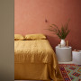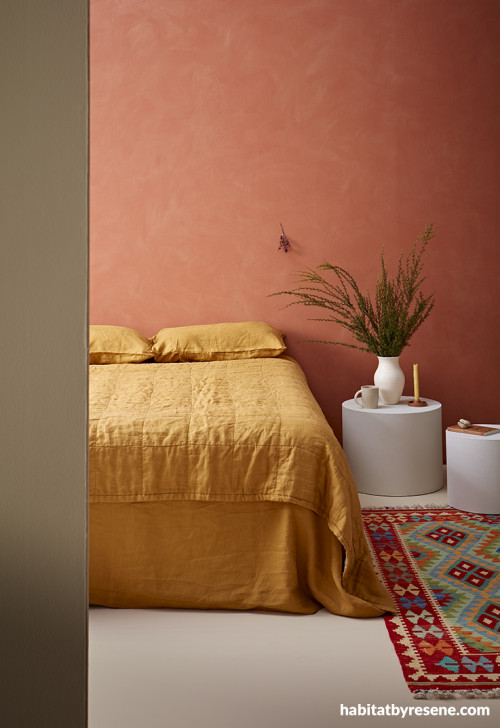 Channel the look of Spanish Colonial architecture and homes built with adobe by using Resene Wild West and Resene FX Paint Effects medium mixed with Resene Sante Fe. Bedside tables in Resene Bianca and Resene Blank Canvas, door in Resene Bitter and flooring in Resene Bianca. Vases in Resene Sand and Resene Blank Canvas. Bedlinen from Foxtrot Home, rug from Città. Project by Gem Adams, image by Wendy Fenwick.