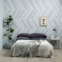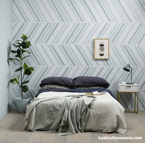 Don’t reserve herringbone patterns just for your floor – try painting this design on your walls for a creative twist on a classic pattern. Wall base colour Resene Quarter Duck Egg Blue with angled/herringbone stripes in Resene Duck Egg Blue and Resene Inside Back. Flooring in Resene Colorwood Mid Greywash and side wall in Resene Inside Back. Duvet cover, pillowcases, throw, cushions, timber plinth nightstand, smoked glass lamp and moon lamp from Città Project by Laura Lynn Johnston, image by Bryce Carleton.