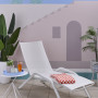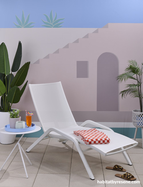 Visit the Hotel California without leaving your home with a Palm Springs-inspired mural that would add some razzle dazzle to a plain a courtyard. The mural is painted in Resene Polo Blue (sky), Resene Paradise (pool and agave), Resene Rainee (agave), Resene Soothe (main wall), Resene Swirl (left wall), Resene Martini (ground, step sides), Resene High Tide (door and window) and Resene Half Black White (pool edge). Patio pavers in Resene Concrete Stain Bleached Grey, large plant pot in Resene Half Black White, rattan plant stand in Resene Half Black White, tray in Resene Polo Blue and vases and pots in Resene Rainee and Resene Soothe. Sun lounger and side table from Poynters, towel from Tessuti, bird of paradise and palm plants from Nood, sunglasses from Le Spec. Project by Laura Lynn Johnston, image by Bryce Carleton.