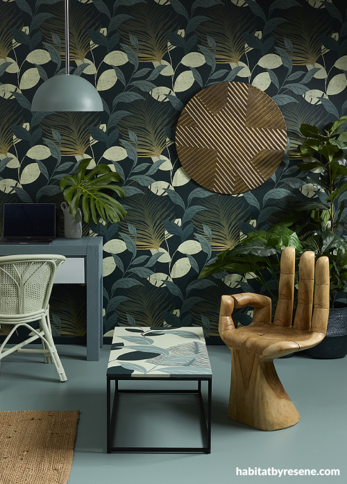 Resene Wallpaper Collection 47404 is a stylised botanical which is ideal for creating drama and interest to an office or living room. Embrace the maximalist trend by mixing patterns by reversing out the pattern on the coffee table painted in Resene Pale Leaf (background), Resene Thor (vine leaves), Resene Swamp (large simple leaf) and Resene Green Meets Blue (palm leaf). Pendant light, floor and desk (side and top) in Resene Thor, desk drawer in Resene Casper and hand chair stained in Resene Colorwood Driftwood (applied with rag). Artwork from Nood Project by Megan Harrison-Turner, image by Bryce Carleton.