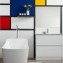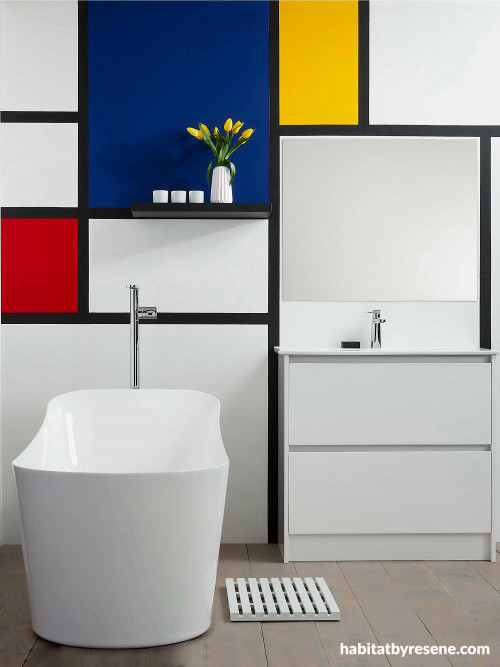 Bathroom walls are the perfect blank canvas for a little creativity. This one is painted in Resene Eighth Black White with the Mondrian grid painted in Resene Blackjack with colourful blocks in Resene Jalapeno, Resene Aviator and Resene Galliano. The timber floorboards keep the room looking warm and are painted in Resene Colorwood Mid Greywash. Shelf in Resene Blackjack, duckboard in Resene Black White and vase in Resene Half Black White. Accessories are stylist’s own. Project by Megan Harrison-Turner. Image by Bryce Carleton.