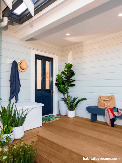 Nothing says relaxed beach style more than a range of soft blues, pale greys and seafoam whites Front door painted in Resene Blue Night with trims and doorframe in in Resene Alabaster. The weatherboards are Resene Half Periglacial Blue bench seat in Resene Coast, storage box in Resene Poured Milk other pots in Resene Slipstream and Resene Grey Seal.