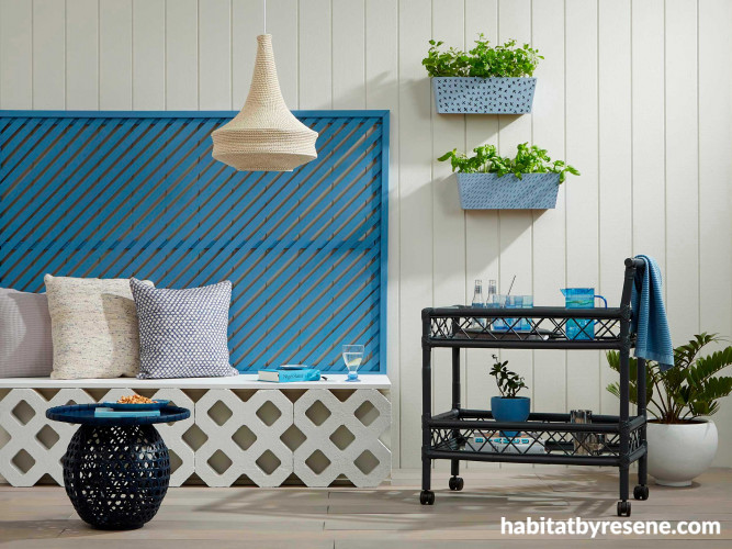 Decks are a great long weekend project. Turn your deck into a conversation corner by creating a garden bar using a screen painted in Resene Kashmir Blue and a seat built from breeze blocks and a plank, painted in Resene Triple Merino. Decorate with planters painted in Resene Smokescreen with spots in Resene Indian Ink. The moveable trolley, painted in Resene Indian Ink, makes it easy to switch this area up from garden bar into a family zone for boardgames or barbeques.