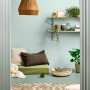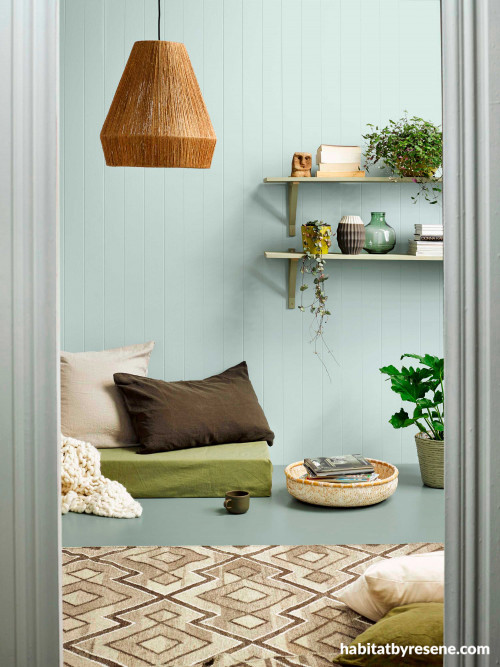Keep your book nook looking fresh with walls in Resene Duck Egg Blue and floor in a slightly darker shade of Resene Inside Back. The door frame is in Resene Black White and the shelves are in Resene Passport. The round planter is in Resene Native and the small plant pot is in Resene Grass Hopper. The basket planter is painted in Resene Half Evolution. Pillowcases from Bedouin Societe, vase from House Doctor, throw, pot plants, basket and rug from Freedom Furniture. Project by Claudia Kozub. Image by Melanie Jenkins.