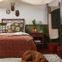 The wall of this woodland room is in Resene Eighth Joss and the tongue-and-groove panelling provides forest hues in Resene Finch. The rich floor colour adds warmth and is painted in Resene Digeridoo with the bedside table, canopy peg and ladder in a lighter Resene Redwood. The baskets provide colourful storage and are painted in Resene Farenheit. DIY animal masks are painted in Resene Hairy Heath, Resene Doeskin, Resene Sambuca, Resene Black Forest and Resene Nero. Cushions, duvet, lamp and throws from Citta, rug from Nood, calico cotton from Spotlight. All other items are stylist’s own. Project by Laura Lynn Johnston. Image by Bryce Carleton.