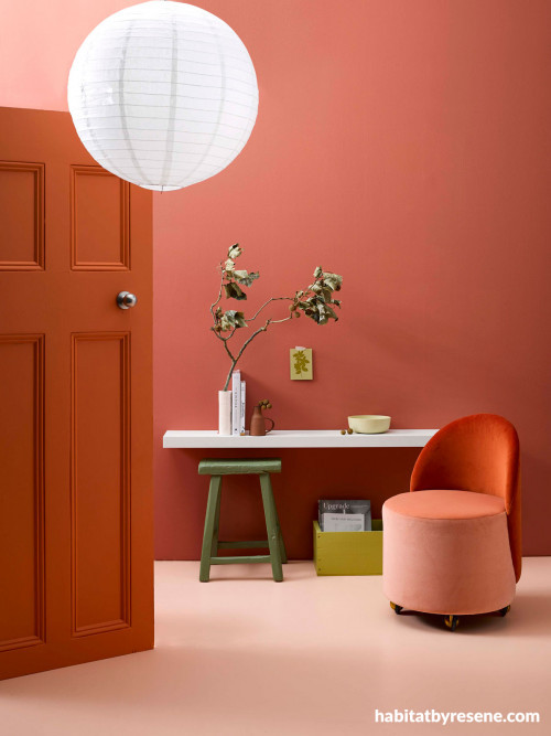 Try a tonal terracotta room with a wall in Resene Apple Blossom, door in Resene Sebedee and floor in Resene Wax Flower. The bowl is in Resene Yuma, stool in Resene Woodland, crate in Resene Gingko, thin vase in Resene Just Right and the tea light holder in Resene Pale Oyster. The chair is from Douglas and Bec, postcard on wall from Garden Objects, books from Paper Plane, jug from Blackbird Goods, rice paper shade from Wah Lee Co. Project by Gem Adams, image by Wendy Fenwick.