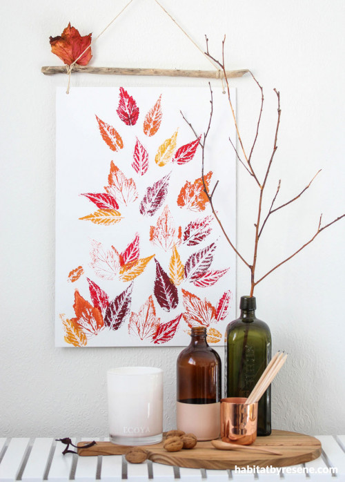 While away a rainy afternoon making this autumn-leaf print in two simple steps with fresh or fallen leaves and a dried branch from your garden. Style the finished product as part of a decorative vignette that includes an arrangement of dried flowers or foliage that you can leave au naturel or paint to match.