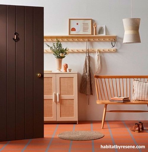 If you prefer to keep your walls plain and simple, have some fun with your flooring instead. Closed borders be damned – this autumny entryway takes you to Tuscany in no time, and it’s created not with tiles but with Resene Walk-on paint, formulated for maximum durability for floors and walking areas. Paint your floor with your base ‘grout’ colour (we’ve used Resene Raven) and allow to dry, then use a ruler and pencil to measure and mark your floor before masking with painter’s tape to create your grid and applying your ‘tiles’ (we’ve used Resene Tuscany). Remove the tape and coat the whole floor in Resene Concrete, which will help keep your floor looking good.