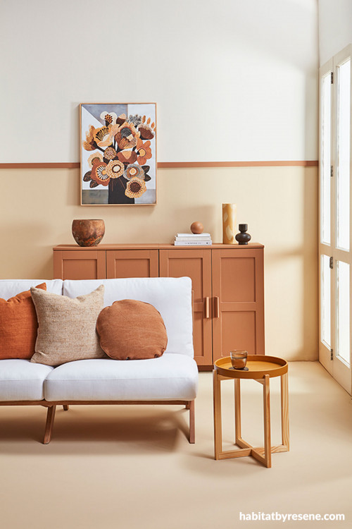 Top of wall and window frame in Resene Spanish White, batten in Resene Brown Sugar, lower wall and floor in Resene Canterbury Clay. Cabinet in Resene Brown Sugar, large pot in Resene FX Faux Rust Effect, round ornament in Resene Brown Sugar, tall vase in stripes of Resene Tussock and Resene Calico, short shapely vase in Resene Wood Bark and coffee table in Resene Putty. Sofa from Freedom, cushions from Città, artwork Harvest Bunch by Kirsten Katz, glass on table stylist’s own. Project by Vanessa Nouwens, image by Wendy Fenwick.