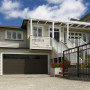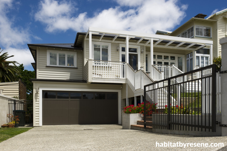 The exterior is now smart in a colour scheme of Resene Caraway weatherboards, windows in Resene Black White, and sills and garage door in Resene Mondo.