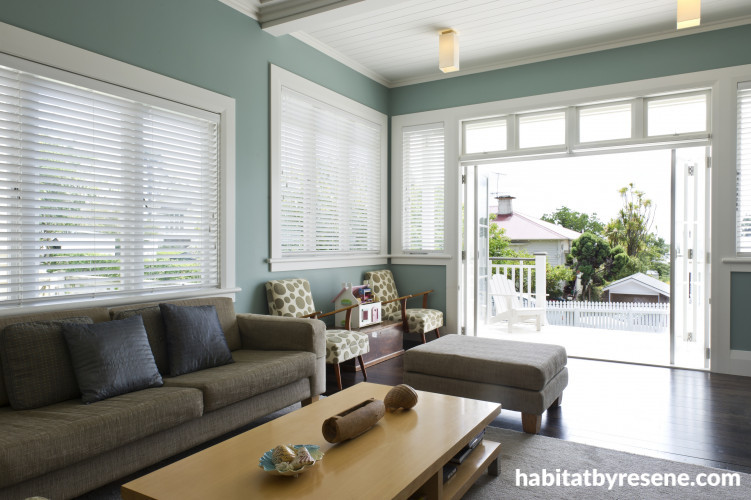 Fleur’s modern interpretation of the house’s original colours includes living room walls in Resene Metamorphis.