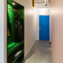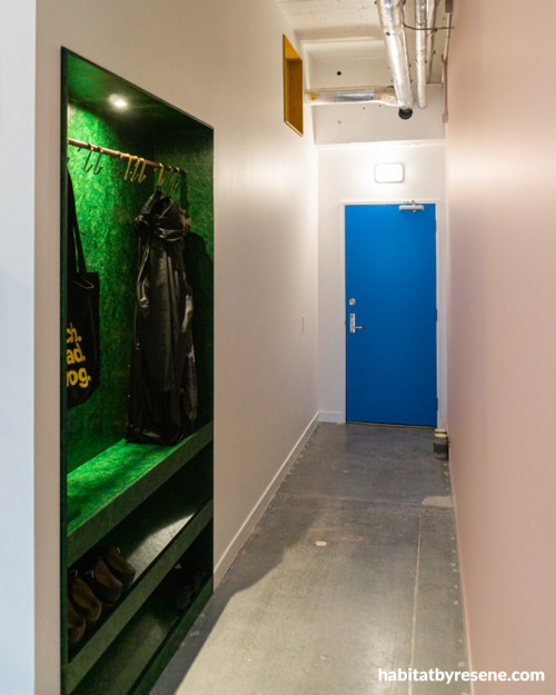 Bright pops of colour feature in the entryway with Resene Pelorous on the front door, and Resene Colorwood Emerald Green in the coat nook. The right wall is painted in Resene Blanched Pink and the left wall and ceiling in Resene Alabaster. “Our apartment features steel factory windows and concrete structural elements, so utilising surprising planes of colour is a means to balance the industrial feel and create a stimulating yet homely interior,” says Geordie.