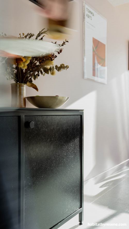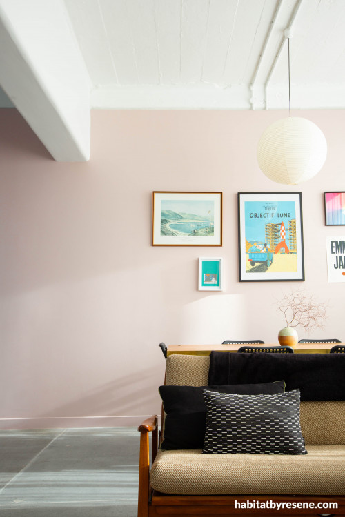 The wall running the length of the hallway through the kitchen and living area is painted in Resene Blanched Pink from the Karen Walker Paints collection from Resene. “It was the only colour we both agreed on from the start!” says Geordie.